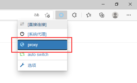 5、在 Edge 的插件栏点击 Proxy SwitchyOmega 插件,选择我们设置的情景模式 proxy。